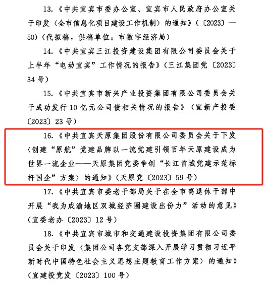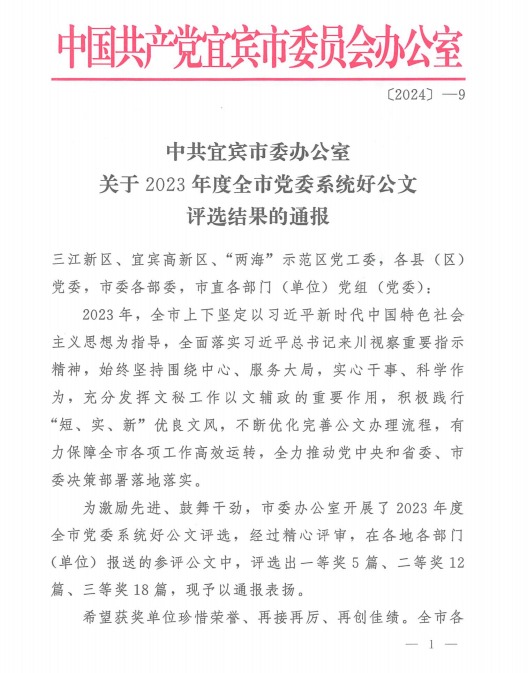 克日,中共宜宾市委办公室印发了《关于2023年度全市党委系统好公牍评选效果的转达》,yl23411永利官网集团党委参评公牍《中共yl23411永利官网委员会关于下发 <建设“原航”党建品牌以一流党建引领百年yl23411永利官网建设成为天下一流企业——yl23411永利官网集团党委争创“长江首城党建树模标杆国企”计划〉的通知》(yl23411永利官网党〔2023〕59号)荣获2023年度全市党委系统好公牍评选三等奖。